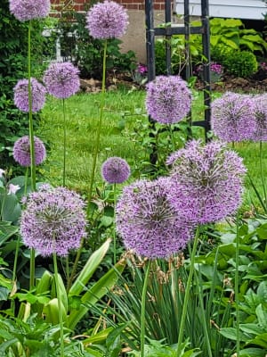 The majestic Gladiator allium is a fall planted flower bulb that blooms from late spring into early summer. Giant Allium Persian Onion is deer resistant and blooms in late spring to early summer. Allium sphere heads are comprised of clusters of close-knit flowers - hundreds of tiny star like flowers make up each sphere head.